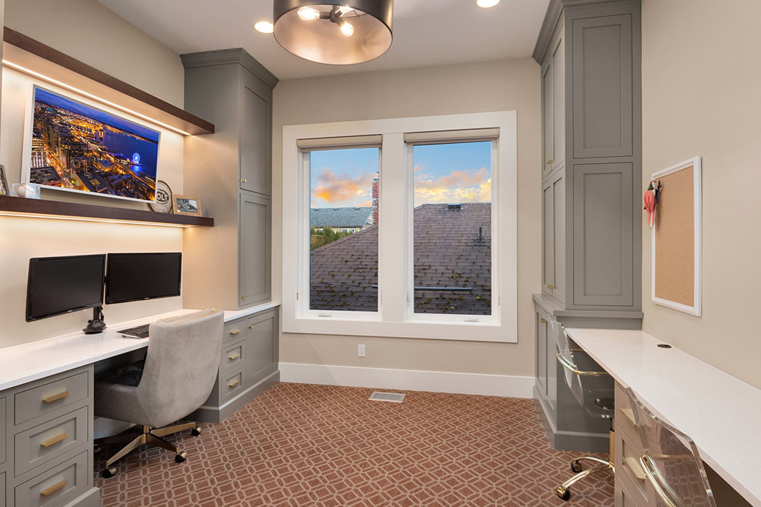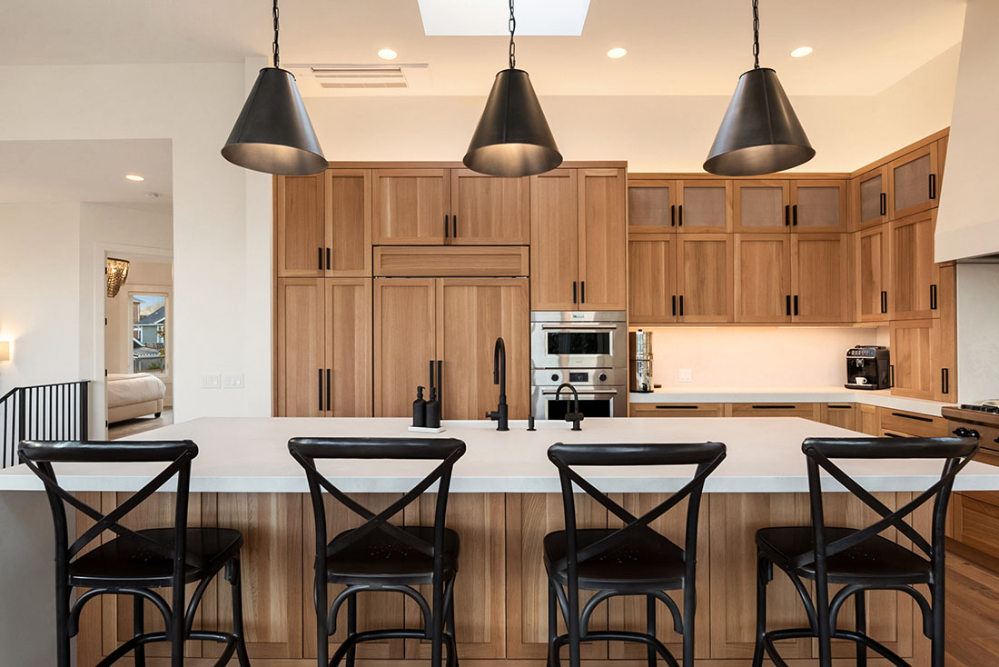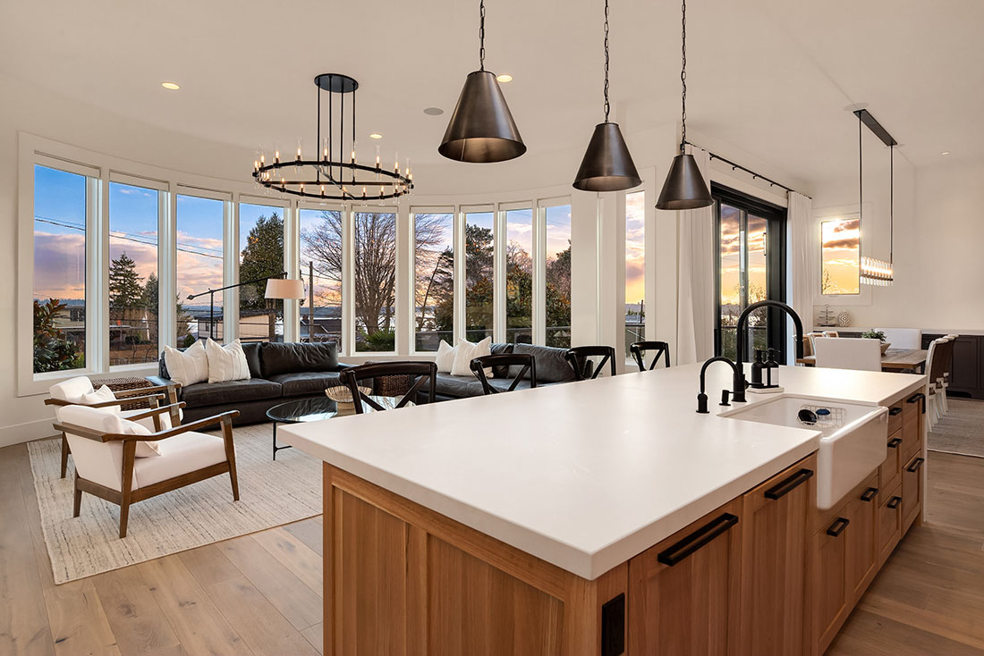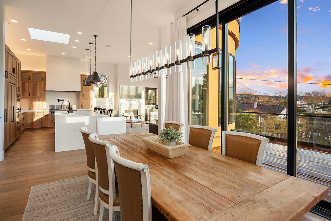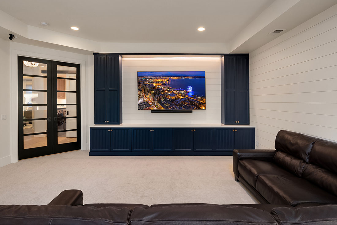 This extensive home remodel integrated tailored and luxurious living spaces to reflect the lifestyle of a builder and designer couple and their family. It features custom white oak cabinetry, neutral tones and organic, natural materials throughout the kitchen for a timeless and beautiful design. Opening up the living and dining areas created more open space to bring together the homeowner’s love of cooking and entertaining. Much of this 3,500-square-foot home is customized, including a black steel entry door, custom metal handrails, a Venetian plaster fireplace, and a motorized roof on the deck extending the entertaining possibilities throughout all the Pacific Northwest seasons. A media room with custom cabinetry and surround sound was added as a centerpiece for family activities.