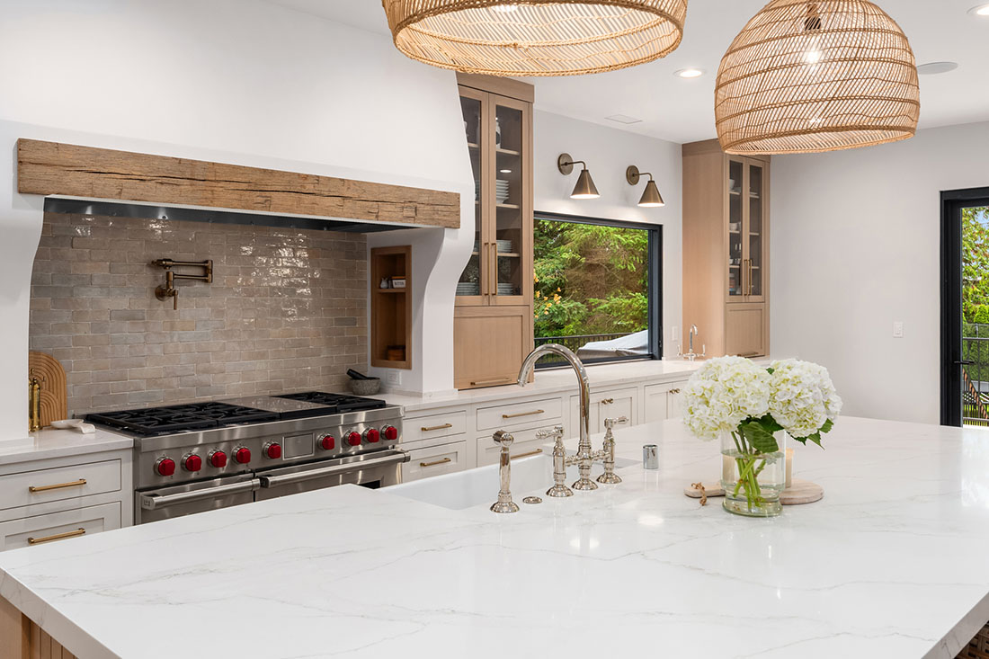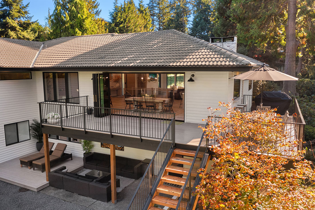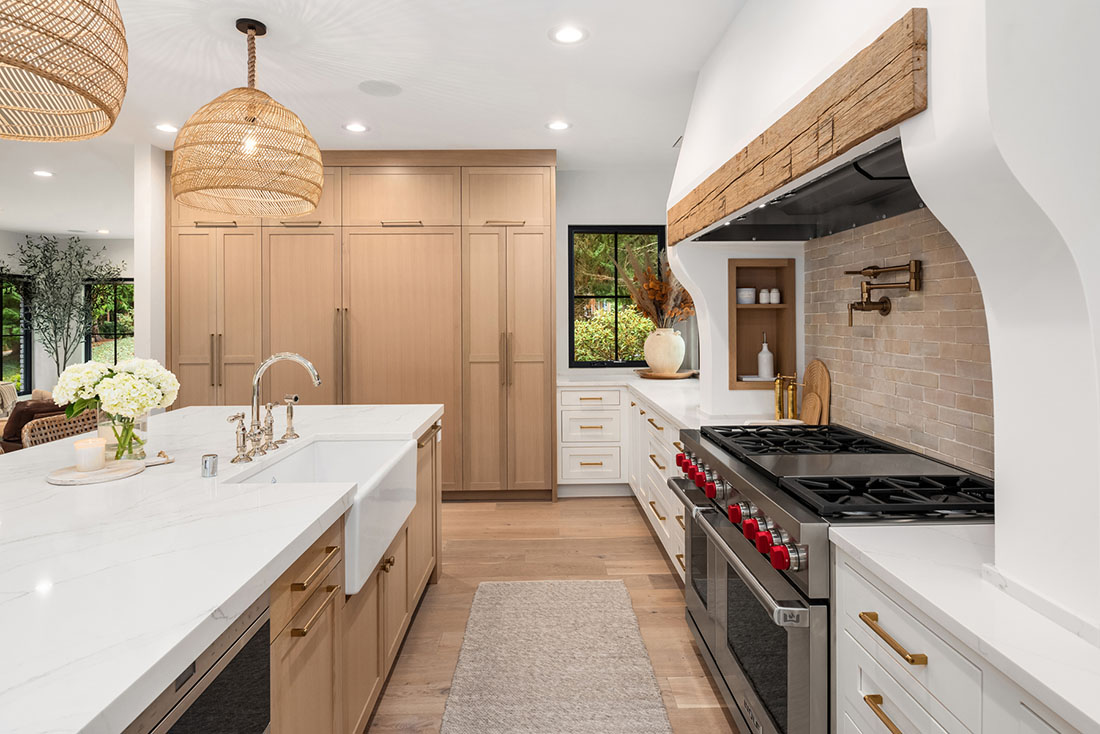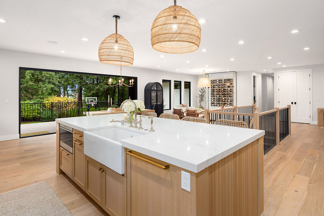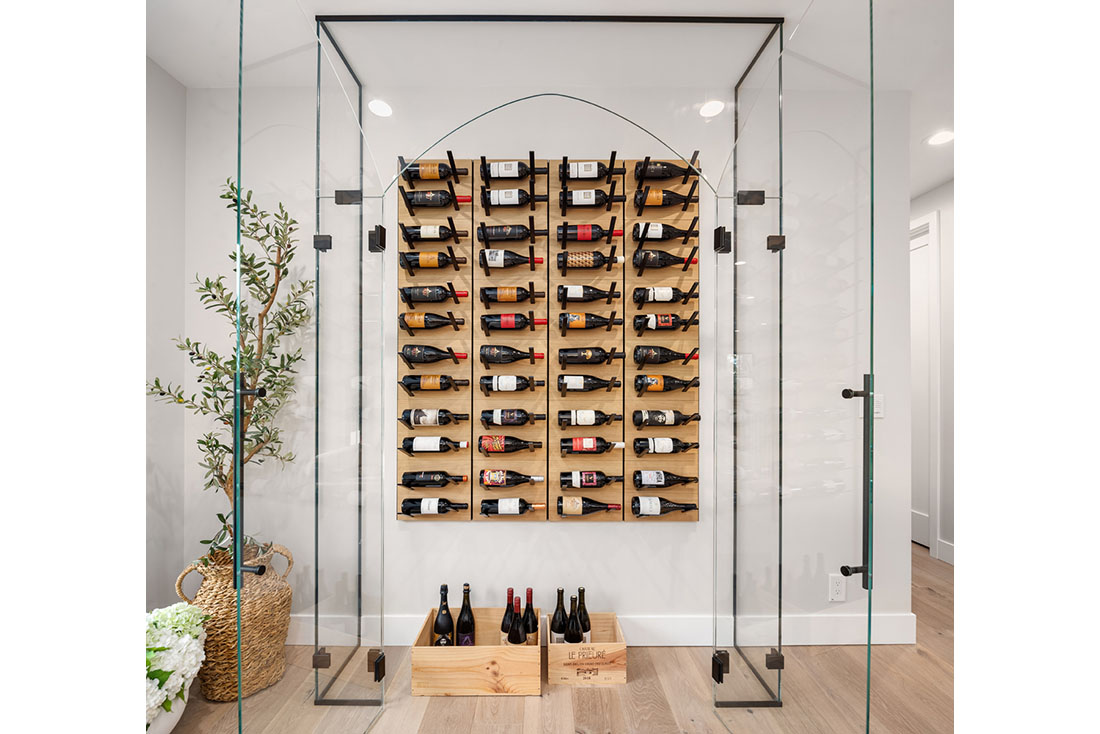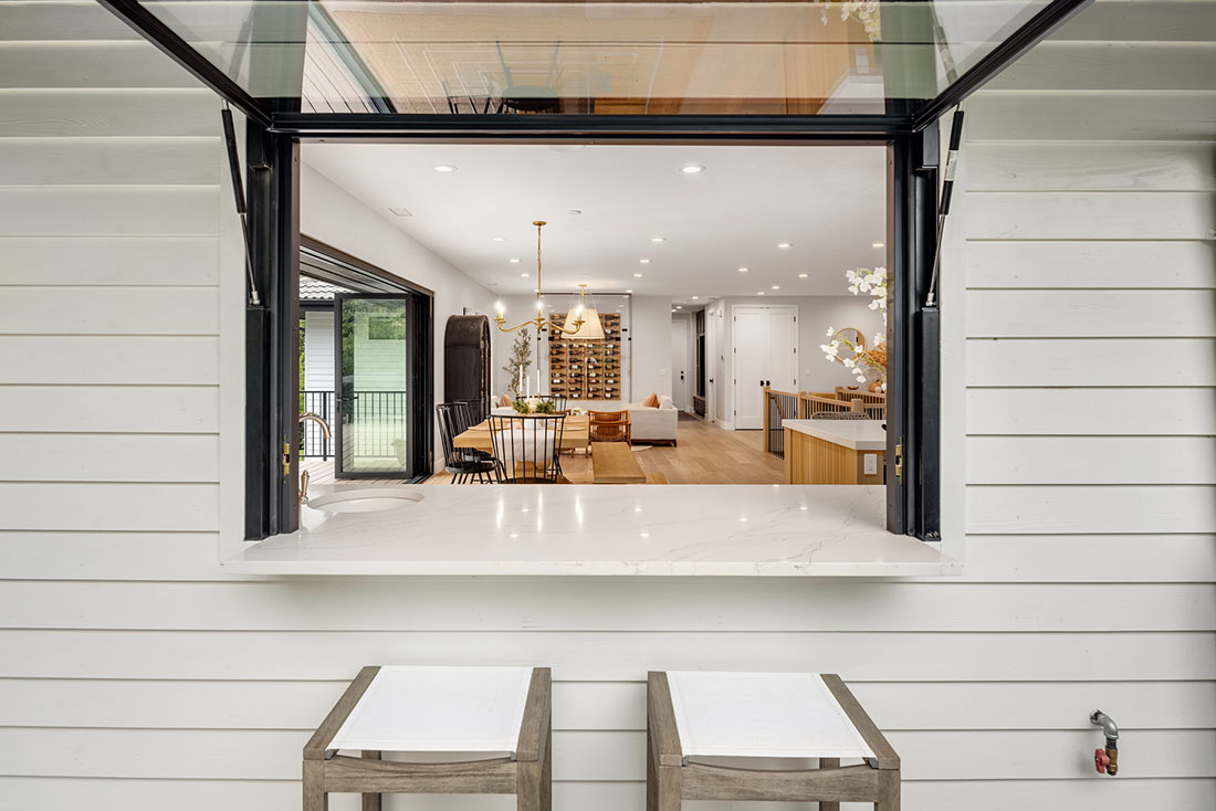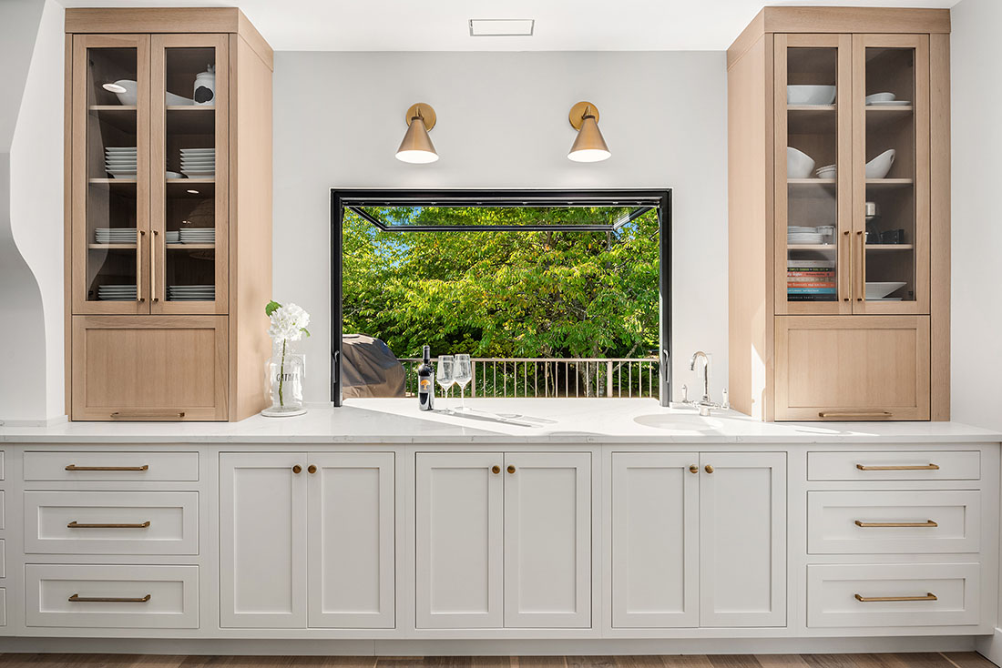 A 10-foot island and large custom hood are the focal points of the kitchen for everyday use and entertainment. The warm palette of materials used throughout the home is accentuated by the excess of natural light coming through the newly updated single mullion style windows. Entertaining is a breeze with a 15-foot LaCantina folding door and countertop flip window opening to the upper deck. The arched, glass-encased wine wall creates an elegant bottle storage for wine lovers. The backyard is a dream for the active family with a built-in gas fire pit, sport court, and updated outdoor shed.